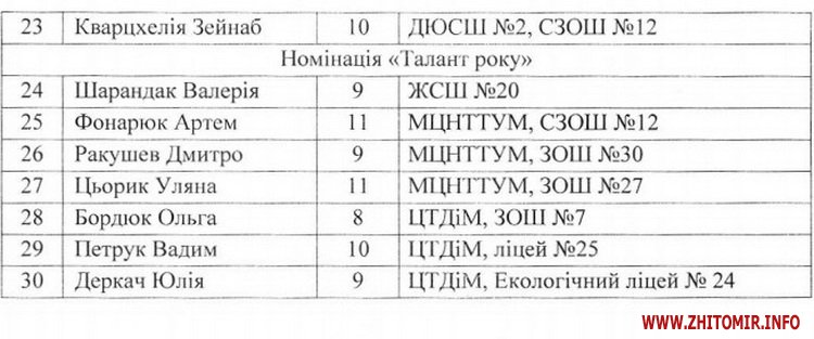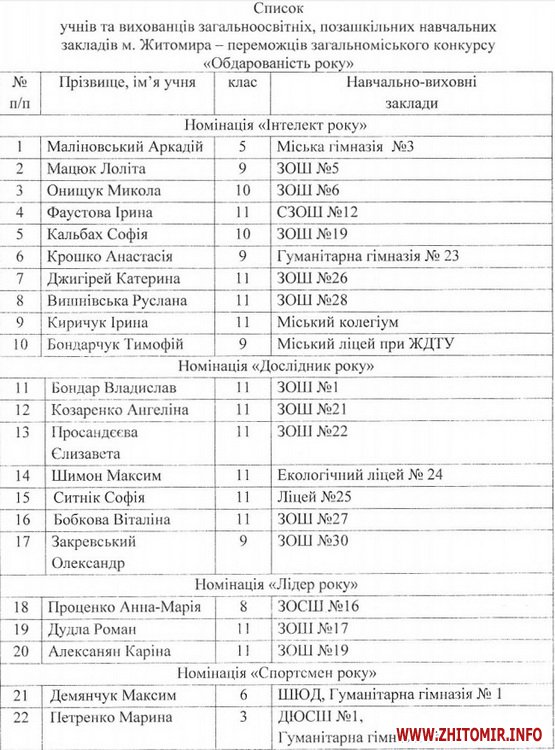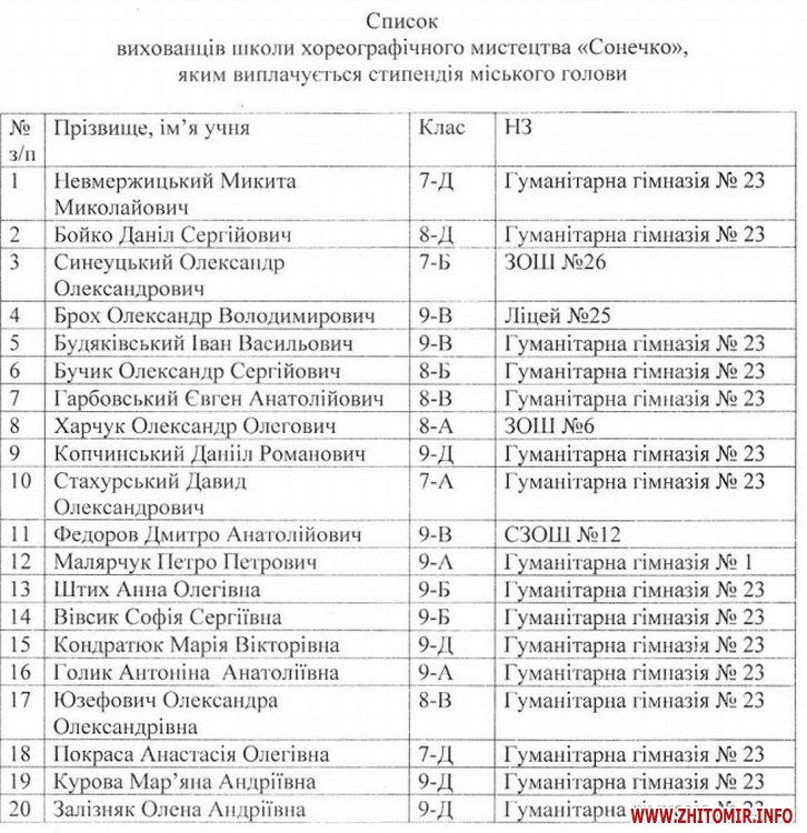 Розпорядження мера Житомира «Про виплату стипендій міського голови учням і вихованцям загальноосвітніх, позашкільних навчальних закладів м. Житомир» 5 жовтня 2017 року опубліковане на сайті міськради.