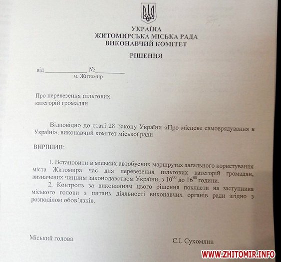 «Встановити в міських автобусних маршрутах загального користування міста Житомира час для перевезення пільгових категорій громадян, визначених чинним законодавством України, з 10.00 до 16.00 години», - зазначається у проекті рішення, який був підготовлений лише ввечері 10 жовтня і на сайті міської ради не оприлюднений.