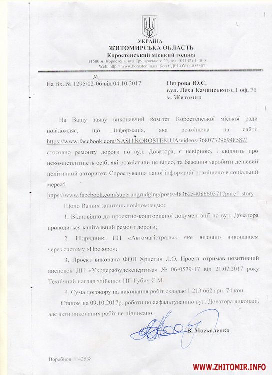 Проте, за словами міського голови Коростеня Володимира Москаленка, ремонт на Доватора зробили нормально, а відео – витівки його політичних опонентів, які приїхали у розпал підготовчих робіт. Крім того, мер збирається публічно пристидати неслухняних «укропівців».