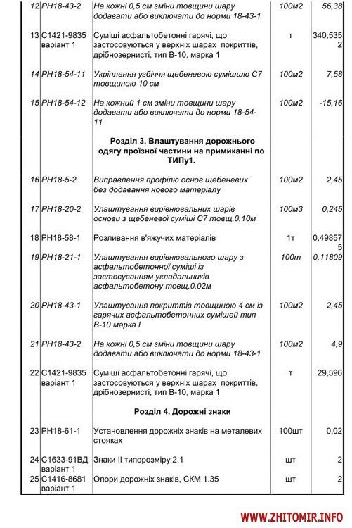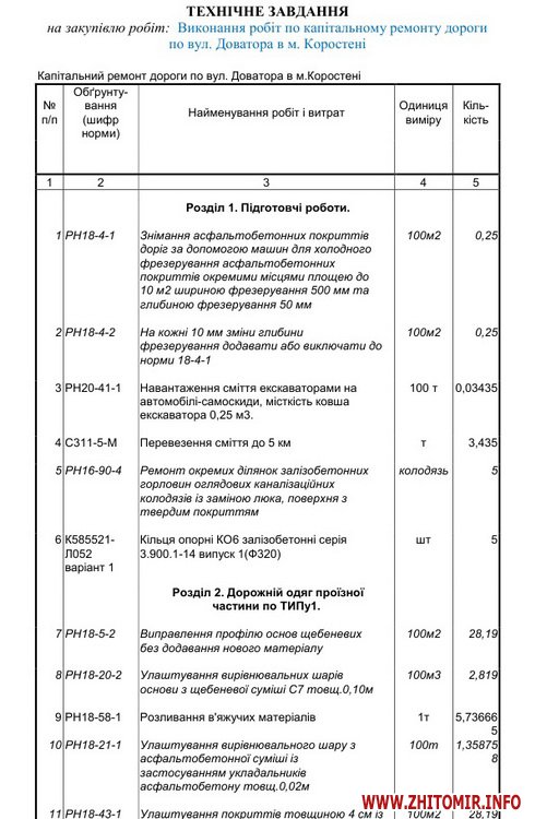 Згідно з технічним завданням, за 1 213 662 гривень підрядник мав спершу підготувати дорогу до капітального ремонту. Зокрема, зняти старий асфальт, замінити каналізаційні люки на нові, потім вирівняти дорогу щебенем, укласти асфальт, укріпити узбіччя щебеневою сумішшю і, врешті-решт, встановити дорожні знаки на металевих стояках.