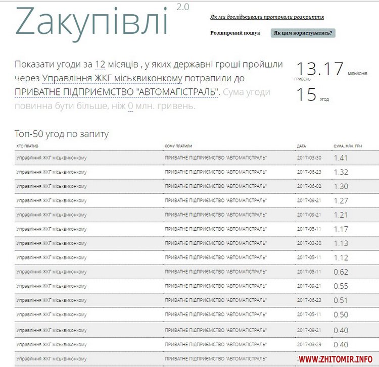 За данними проекту Zакупівлі, у 2017 році Управління житлово-комунального господарства виконавчого комітету Коростенської міської ради уклало з приватним підприємством «Автомагістраль» договорів на 13 мільйонів гривень.