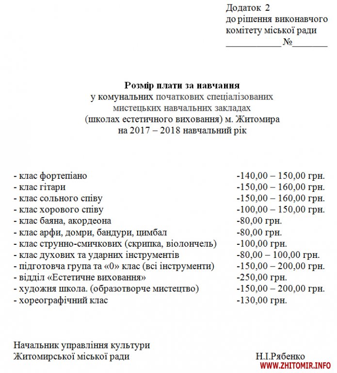 «Розмір плати за навчання у школах естетичного виховання дітей м. Житомира визначається один раз на рік та установлюється дирекцією закладу за погодженням з управлінням культури Житомирської міської ради відповідно до чинного законодавства», - зазначається у проекті рішення.