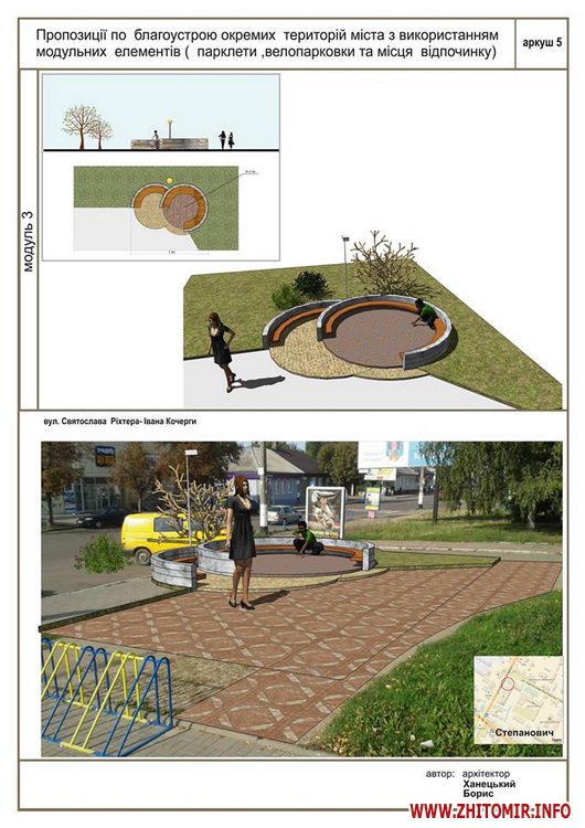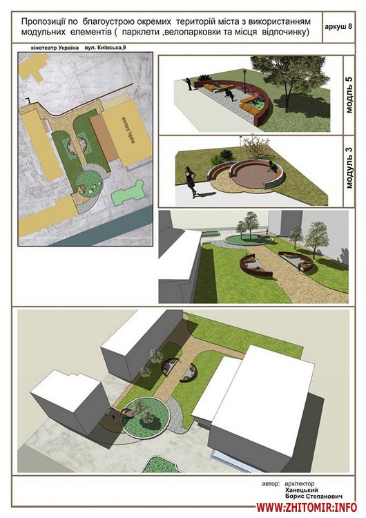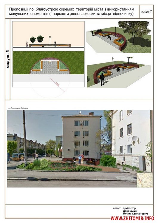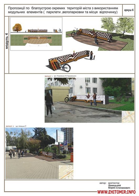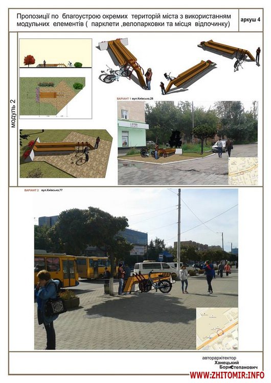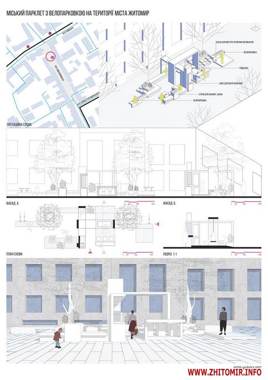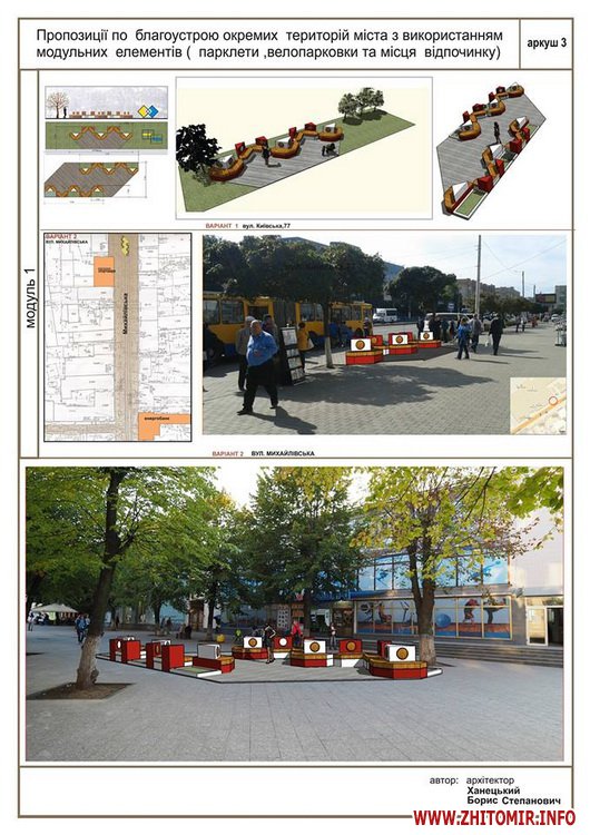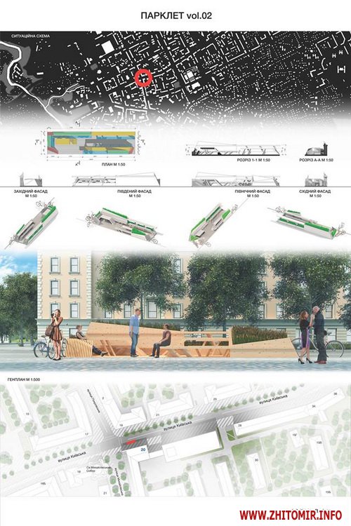«Передпроектні пропозиції учасників конкурсу на кращий дизайн та розташування парклету в місті Житомирі. Умовами конкурсу були запропоновані реконструйовані частини вулиці Київської та частина Михайлівської (біля магазину «Спорттовари»). Конкурс відбувався місяць. Нарешті ми отримали результати, з якими ви можете ознайомитись», - йдеться в дописі.