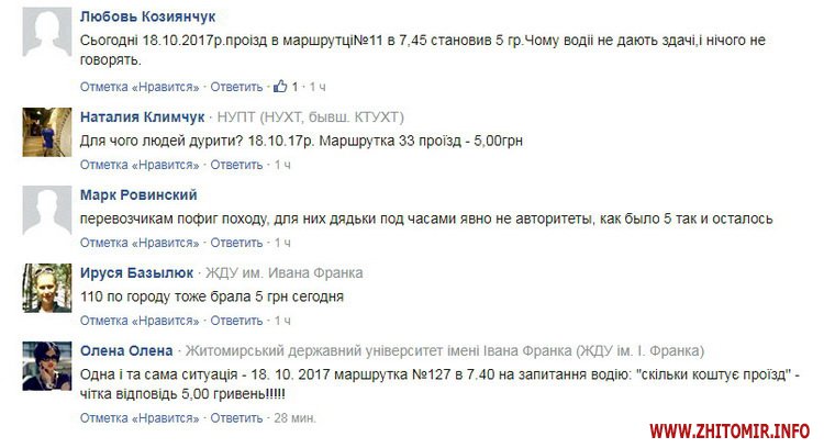 По 5 гривень везли ранкових пасажирів і маршрутки №№30, 33, 11, 5, 108, 10, причому один з водіїв маршрутки №10 брав з людей і по 4, і по 5 гривень, якщо ті не питали здачу. Про відмову возити по 4 грн житомиряни пишуть у коментарях: