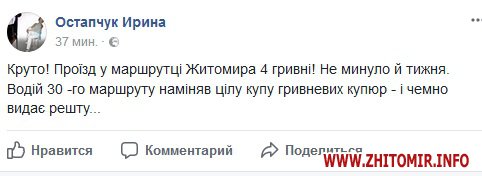 «Круто! Проїзд у маршрутці Житомира 4 гривні! Не минуло й тижня. Водій 30 -го маршруту наміняв цілу купу гривневих купюр - і чемно видає решту...», – пише житомирянка Ірина Остапчук.
