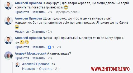 У коментарях під дописом парубок додає, що й у приміській маршрутці №110 з нього взяли 4 грн. Натомість, житомирянка Лариса Паламарчук пише, що у маршрутці №108 вартість проїзду не знизили. Те ж саме стосується автобусів, які курсують за маршрутом №126.