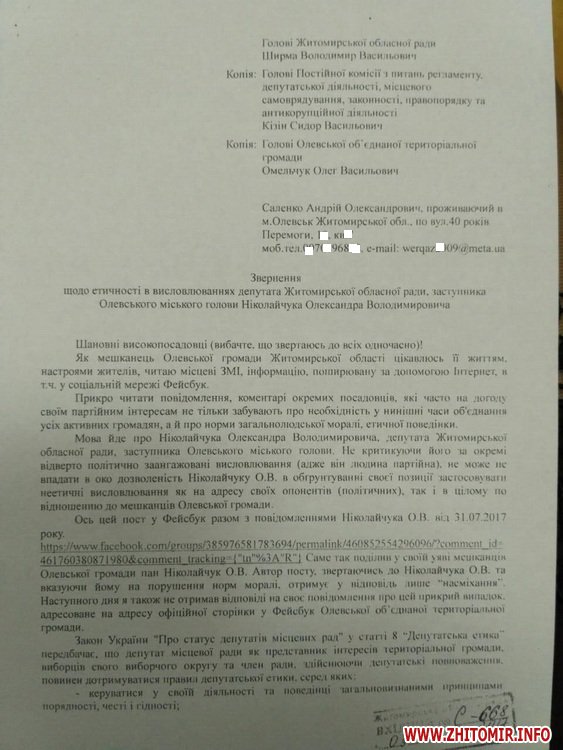 «Є юрист в Олевську, який написав скаргу на депутата Ніколайчука, мовляв, він у фейсбуці когось образив. Була також скарга на Олену Галагузу, Олексія Ясюнецького і Віру Гринишину. Ми не можемо коментувати особисте життя чи особисті висловлювання. Це все одно, що обговорювати те, що на паркані написано. Але, з іншого боку, навіть особисте життя депутата під прискіпливим оком журналістів, громадських активістів і т.д. Тому ми рекомендували всім депутатам обласної ради звернути увагу на статтю 8 Закону «Про статус депутатів місцевих рад», у якій йдеться про депутатську етику», – пояснив у коментарі Житомир.info Сидір Кізін.