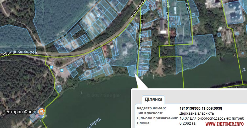 Також в постійне користування управлінню Державного агентства рибного господарства України у Житомирській області передається ділянка площею 0,2362 га, яка розташована в Житомирі на березі річки Тетерів. Нагадаємо, за адресою пров.Гуйвинський,6 знаходиться адмінбудівля управління Державного агентства рибного господарства у Житомирській області.
