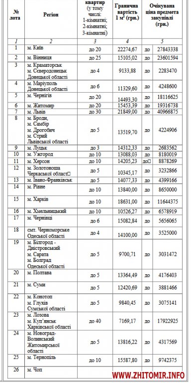 Два лоти з 30 стосувалися Житомирської області: лот 6 – м. Житомир, до 20 квартир; лот 7 – м. Новоград-Волинський, Житомирської області, до 20 квартир.