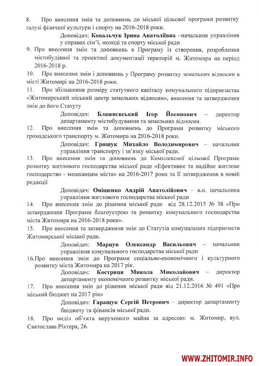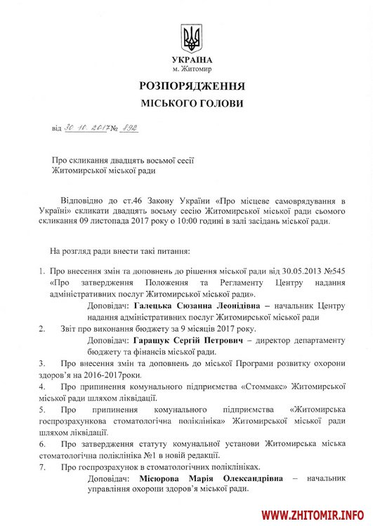 «Відповідно до ст.46 Закону України "Про місцеве самоврядування в Україні" скликати двадцять восьму сесію Житомирської міської ради сьомого скликання 09 листопада 2017 року о 10:00 годині в залі засідань міської ради», – йдеться у документі.