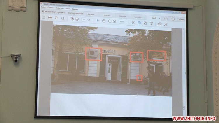 «За рік майже ніяких змін не відбувається. Ми бачимо, що навіть ті, що знаходяться в аварійному стані, не змінюють свої вивіски та оформлення. Ці розмови повинні вестися, ми повинні роз’яснювати, розказувати, що саме, чому і як повинно виглядати, яка процедура погодження, скільки це орієнтовно може коштувати, скільки це часу займе. Відповідати на конкретні запитання: що з моєю вхідною групою не так, чому кондиціонери на фасаді це погано, чому плівка на вікнах - це теж погано, і таке інше», – каже головний архітектор Житомира.