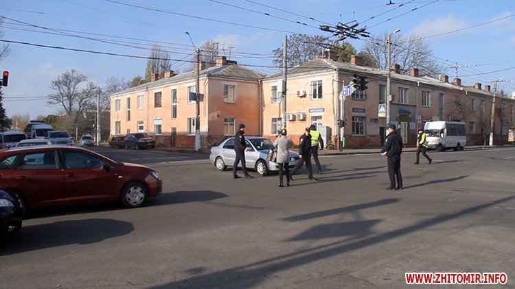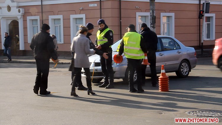 У Житомирі на перехресті вулиць Грушевського та Перемоги 6 листопада зіштовхнулися поліцейська Toyota Prius та Mitsubishi. По вулиці Перемоги утворився невеликий затор з машин.