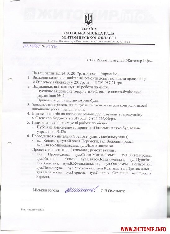 Про це у відповідь на запит журналіста Житомир.info повідомила Олевська міська рада.