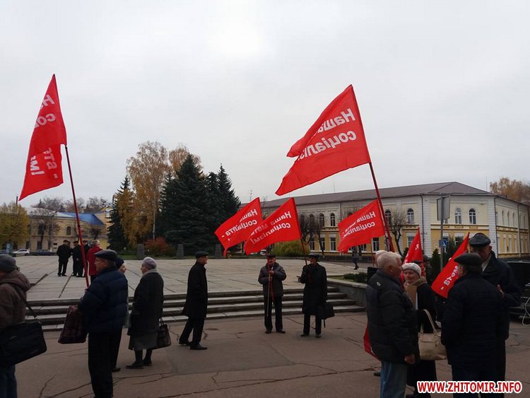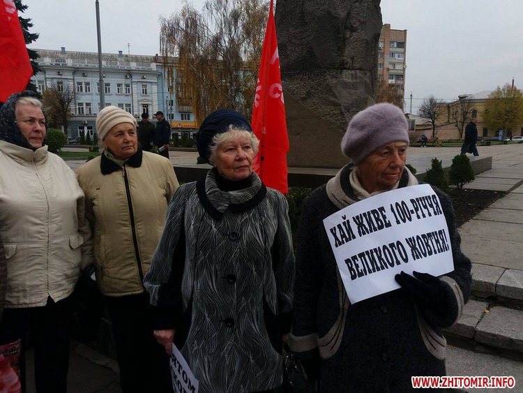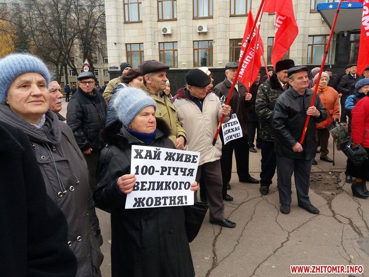 За словами журналіста Житомир.info, який перебуває на мітингу під стінами облдержадміністрації, на захід прийшли трохи більше півсотні людей, в руках яких є плакати з написами «Хай живе 100-річчя Великого жовтня», «Великий жовтень надихає і кличе». Також в руках пенсіонери тримають червоні прапори без комуністичних символік, на них є лише написи «Наша мета – соціалізм».