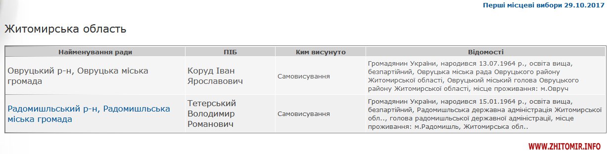 У 13 об’єднаних територіальних громадах виборці віддали більшість голосів за діючих керівників: голів сільських та селищних рад, мера Овруча та голову Радомишльської райдержадміністрації.