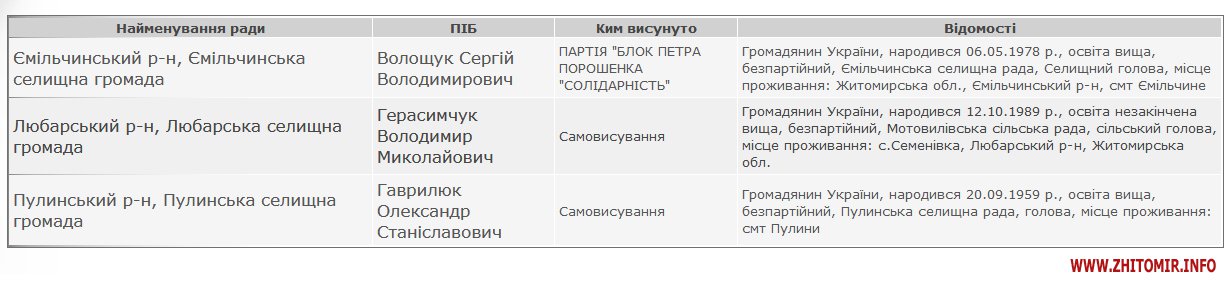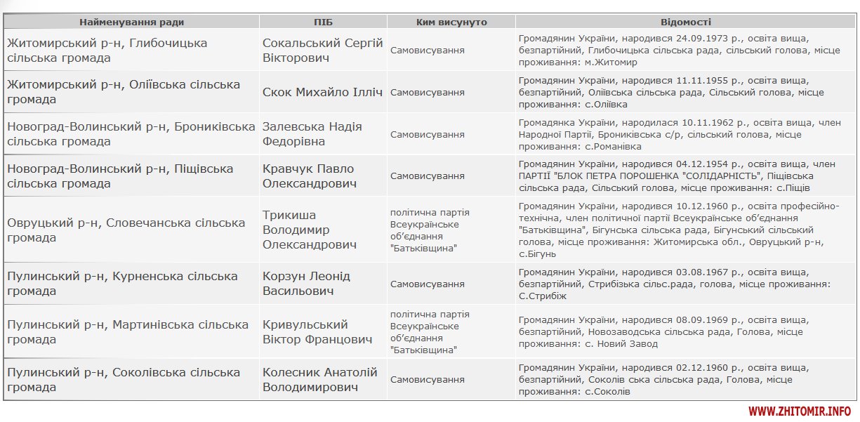 Як повідомляв Житомир.info, у місцевій організації Блоку Петра Порошенка «Солідарність» повідомляли, що 6 із 13 обраних голів ОТГ йшли на вибори від БПП або за його підтримки. ВО «Батьківщина» повідомляла, що її представники вибороли дві посади голів ОТГ у Житомирській області.