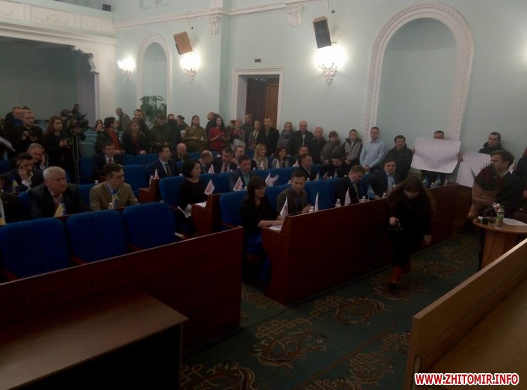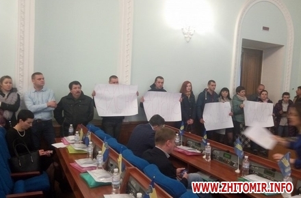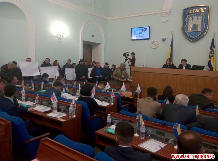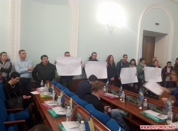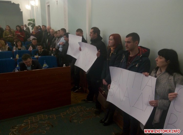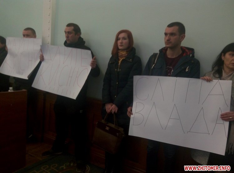 Люди з плакатами «Дайте кисню» та «Сліпа влада», які хочуть підняти питання вирубки лісу в районі житомирської паперової фабрики, прийшли на чергову сесію Житомирської міськради 9 листопада.