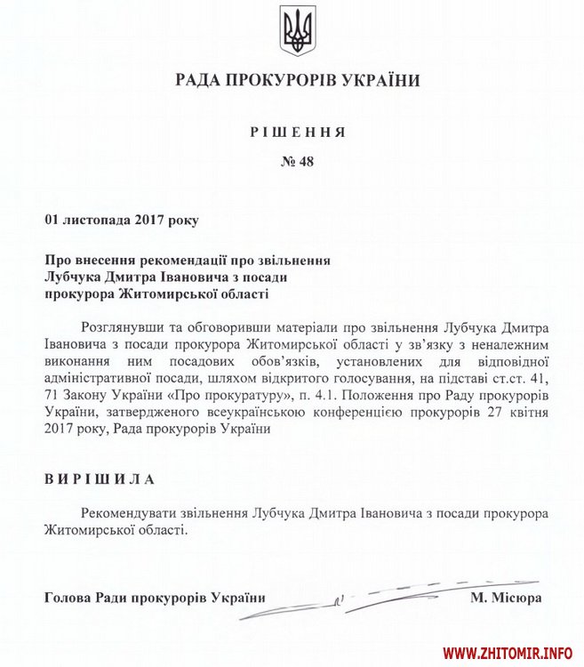 «Розглянувши та обговоривши матеріали про звільнення Лубчука Дмитра Івановича з посади прокурора Житомирської області у зв’язку з неналежним виконання ним посадових обов’язків, установлених для відповідної адміністративної посади, шляхом відкритого голосування , на підставі ст.ст. 41,71 Закону України «Про прокуратуру», п. 4.1. Положення про раду прокурорів України, затвердженого всеукраїнською конференцією прокурорів 27 квітня 2017 року, рада прокурорів України вирішила: Рекомендувати звільнення Лубчука Дмитра Івановича з посади прокурора Житомирської області», - йдеться в документі.