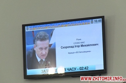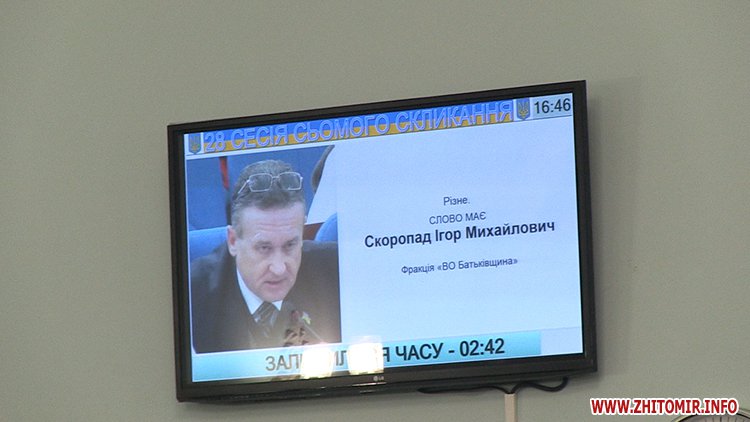 «Перш ніж зачитати свій депутатський запит, я хочу вас поінформувати, звідки він виник, чому він виник. Ви, напевно, всі пам'ятаєте, що у вересні ГО «Об'єднання споживачів природного газу міста Житомира», яку я очолюю, подала позов до суду на ПАТ "Житомиргаз" стосовно виконання норм закону щодо забезпечення індивідуальними газовими лічильниками мешканців квартир, у яких плита. Вимога закону — це потрібно зробити до 1 січня 2018 р. Це підтверджено відповідним розпорядженням Кабінету міністрів, тому ми відстоювали саме цю позицію, щоб «Житомиргаз» забезпечив за свій рахунок лічильниками у квартирах тих мешканців, а не встановлював загальнобудинковий лічильник. На жаль, 1-й раунд, так скажемо, позову нам було відмовлено, і саме тому виник депутатський запит», - зазначив Ігор Скоропад і зачитав його: