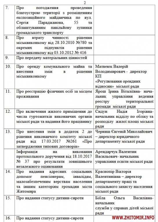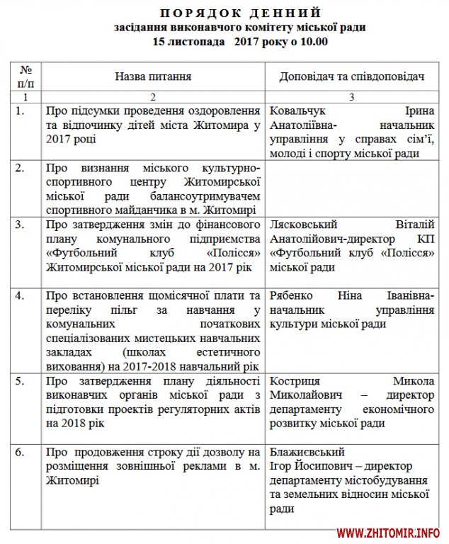 Члени виконкому, зокрема, будуть обговорювати підсумки проведення оздоровлення та відпочинку дітей міста Житомира у 2017 році, розглядатимуть питання про встановлення щомісячної плати та переліку пільг за навчання у комунальних початкових спеціалізованих мистецьких навчальних закладах (школах естетичного виховання) на 2017-2018 навчальний рік, прийматимуть рішення про продовження строку дії дозволу на розміщення зовнішньої реклами в Житомирі.