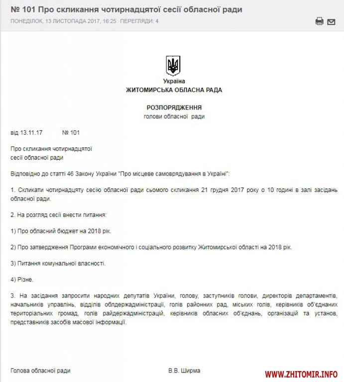 21 грудня депутати Житомирської облради зберуться на чергову сесію, щоби розглянути бюджет на 2018 рік. Розпорядження «Про скликання чотирнадцятої сесії обласної ради» підписав Володимир Ширма 13 листопада.