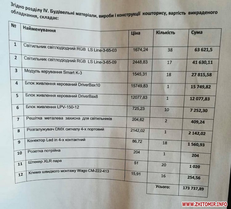 У розпорядженні Житомир.info є документ, в якому зазначається, що саме було викрадене з підвісного мосту, в якій кількості та сума збитків.