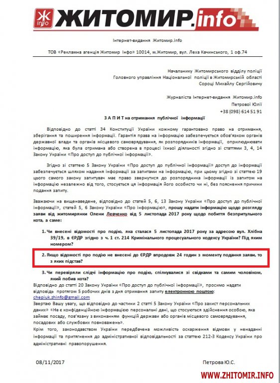 «Повідомляємо, що факт побиття безпритульного кота, що мав місце 5.11.2017 за адресою: м. Житомир, вул. Хлібна, буд. 39/19, зареєстрований в журналі Єдиного обліку заяв та повідомлень про кримінальні правопорушення та інші події Житомирського ВП ГУНП в Житомирській області за №57089 від 05.11.2017 року, відомості за вказаним фактом до Єдиного реєстру досудових розслідувань не вносилися», – йдеться у відповіді на запит.