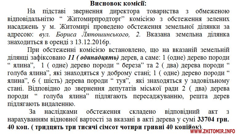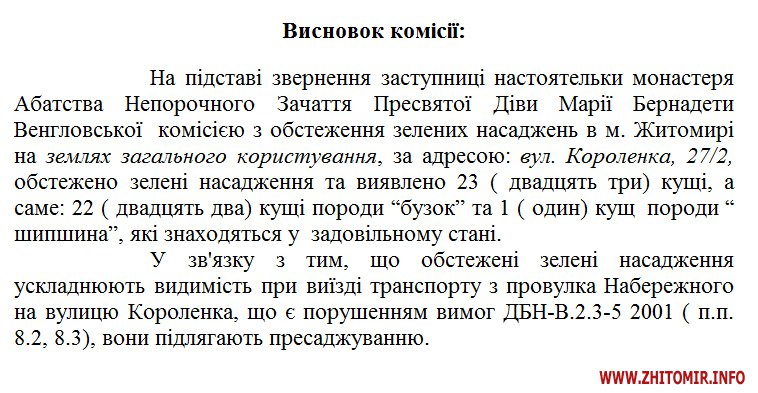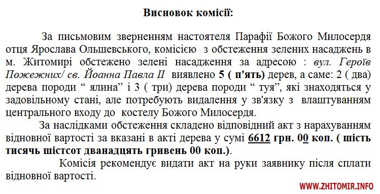 «Дозволити видалити та видати ордер на видалення зелених насаджень, зазначених в акті обстеження зелених насаджень від 11.07.17р. №116, голові координаційної ради Намєсніку С. М. Дозволити видалити та видати ордер на видалення зелених насаджень, зазначених в акті обстеження зелених насаджень від 29.08.17р. №152, настоятелю Парафії Божого Милосердя отцю Ярославу Ольшевському, після подання документа про сплату відновної вартості зелених насаджень, що підлягають видаленню, в сумі 6612,00 грн. Дозволити пересадити та видалити і видати ордер на пересаджування та видалення зелених насаджень, зазначених в акті обстеження зелених насаджень від 03.10.17р. №170, ТОВ «Житомирпродторг», після подання документа про сплату відновної вартості зелених насаджень, що підлягають видаленню, в сумі 33704,40 грн. Дозволити пересадити та видати ордер на пересаджування зелених насаджень, зазначених в акті обстеження зелених насаджень від 10.10.17р. №177, Абатству Непорочного Зачаття Пресвятої Діви Марії», - йдеться у проекті рішення.