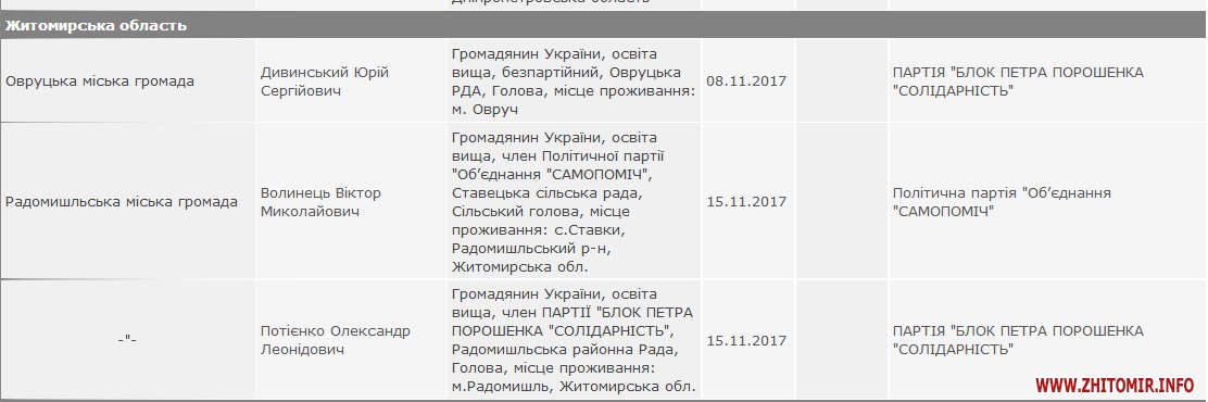 Станом на 20 листопада на сайті ЦВК є інформація про 18 кандидатів, обраних депутатами рад по багатомандатних округах, які вибули. Зокрема, від мандата депутата Овруцької міської громади відмовився голова Овруцької райдержадміністрації Юрій Дивинський, який обирався від Блоку Петра Порошенка. Не захотів бути депутатом ОТГ й ще один представник президентської політсили – голова Радомишльської районної ради Олександр Потієнко, якого обрали представники Радомишльської міської громади. Від мандата в цій ще громаді відмовився Ставецький сільський голова Віктор Волинець, член Об’єднання «Самопоміч».