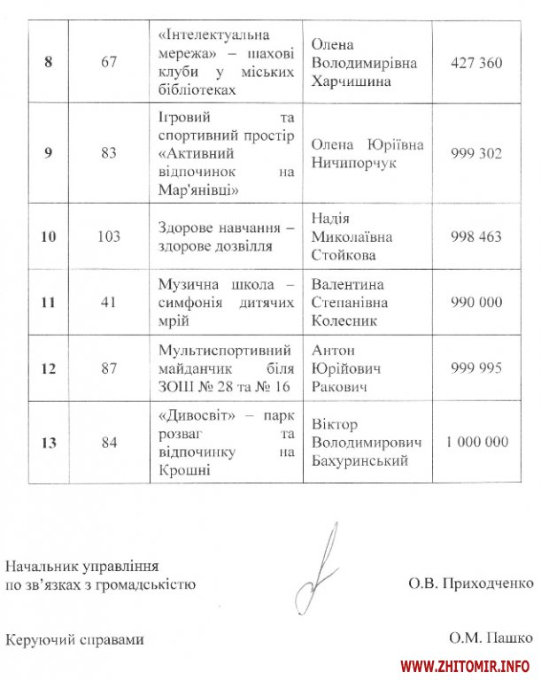 З 13 проектів-переможців, 4 буде реалізовувати управління культури, 3 – управління комунального господарства, 3 – управління освіти, по одному – управління житлового господарства і управління транспорту та зв’язку, в одному проекті виконавцем записане «управління культури будівництва».