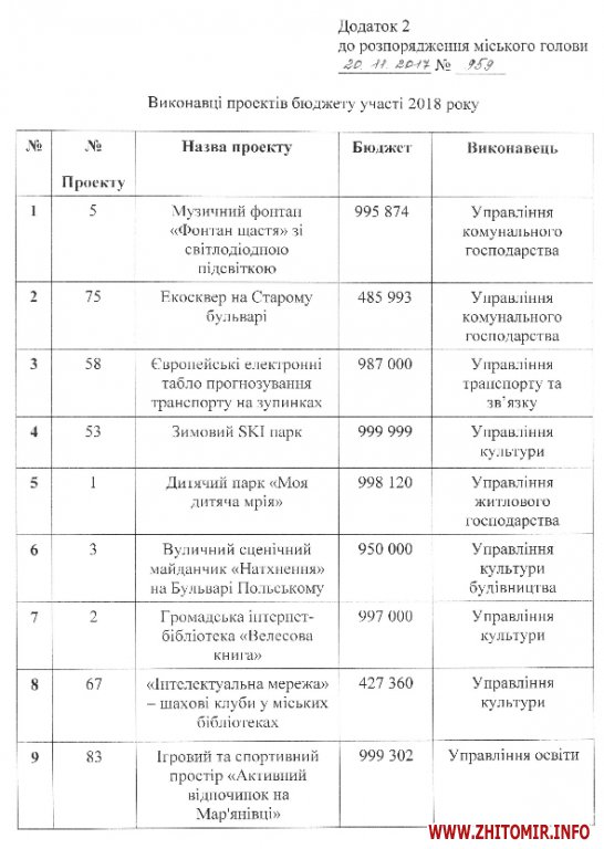 Мер Сергій Сухомлин затвердив перелік проектів, що перемогли у загальноміському голосуванні за проектні пропозиції до бюджету участі 2018 року.