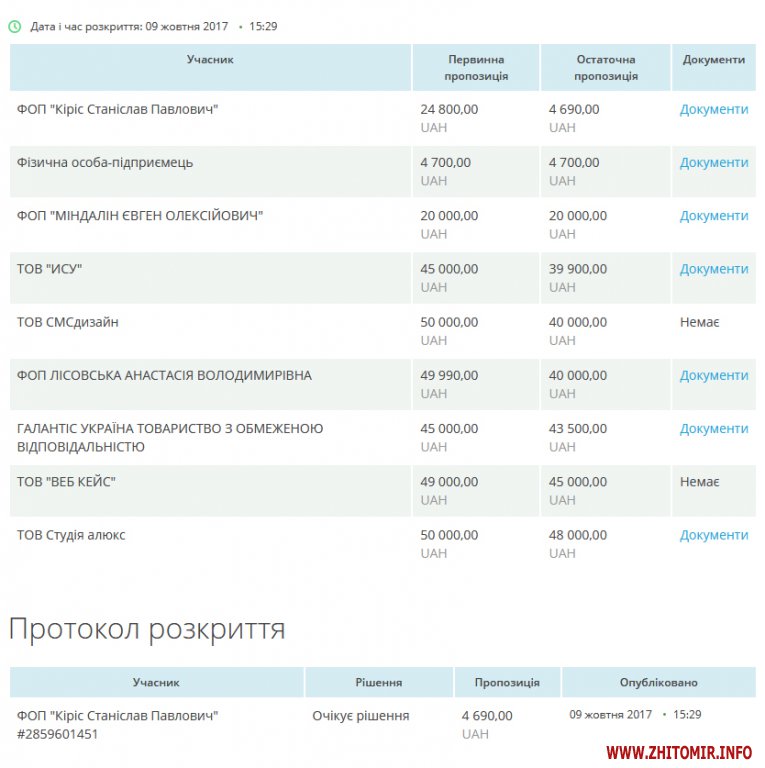 На тендер надійшло дев’ять пропозицій учасників, переможцем став підприємець з Дніпра ФОП Кіріс Станіслав Павлович, який згодився виконати зазначені роботи за 4 тис. 690 грн.