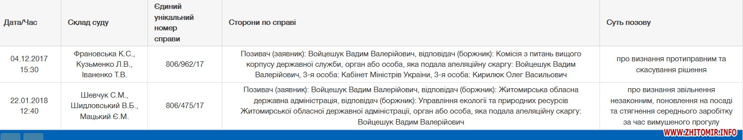 Житомирський апеляційний адміністративний суд зараз розглядає дві справи за позовами Войцешука: про визнання протиправним та скасування рішення, де відповідачем виступає комісія з питань вищого корпусу державної служби, треті особи – Кабінет міністрів, Кирилюк Олег Васильович – т.в.о. Дежравної служби геології та надр; про визнання звільнення незаконним, поновлення на посаді та стягнення середнього заробітку за час вимушеного прогулу – відповідачі тут Житомирська ОДА і управління екології та природних ресурсів.