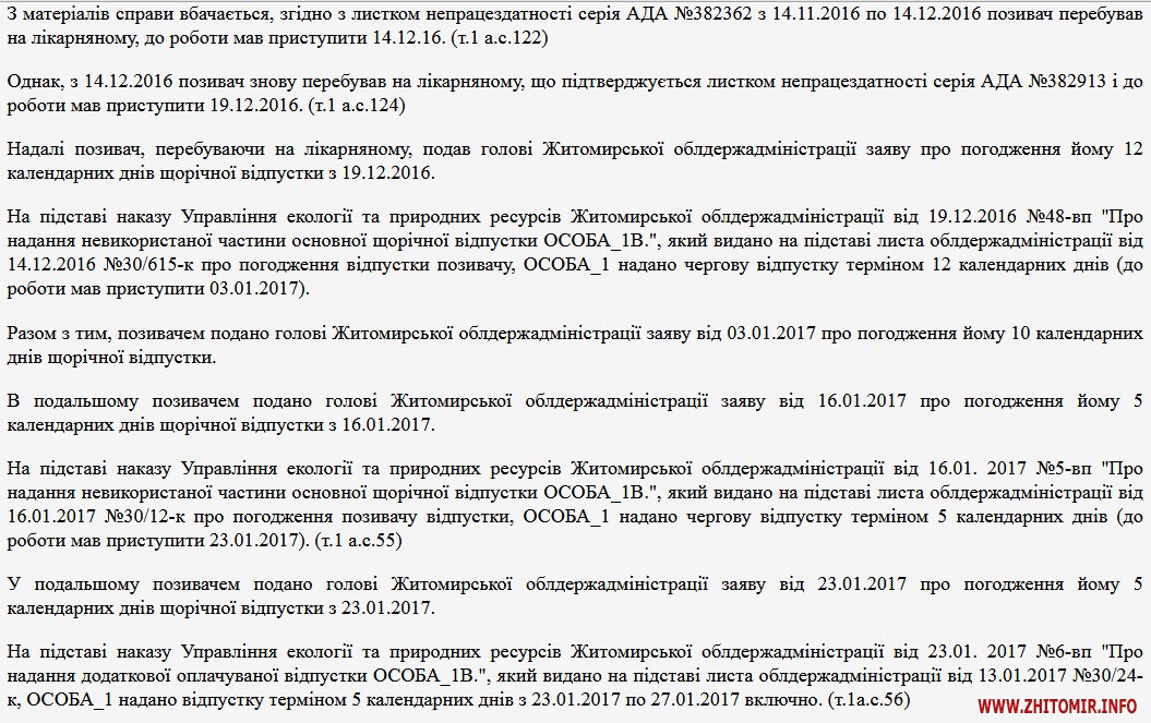 «У позовній заяві ОСОБА_1 вказав, що розпорядженням голови Житомирської обласної державної адміністрації від 07.12.2015 був призначений на посаду начальника Управління екології та природних ресурсів Житомирської обласної державної адміністрації. На кінець 2016 року ним з власної ініціативи прийнято рішення про звільнення із займаної посади через те, що він не виконував посадові обов"язки, не з"являвся на робочому місці, перебував у відпустках та лікувався, про що 14.12.2016 року роботодавцю було подано заяву про звільнення із займаної посади за згодою сторін. Крім того, позивач вказав, що його звільнення було погоджено Міністерством екології та природних ресурсів України 30.12.2016 року, однак про даний факт роботодавець його не повідомив та розпорядження про звільнення не видав, хоча увесь цей період він місце роботи не відвідував, жодних посадових обов"язків не виконував. 26.01.2017 року головою Житомирської ОДА видано розпорядження про звільнення позивача за угодою сторін. Однак, позивач вважав, що його заява від 14.12.2016 року про звільнення за згодою сторін є фактично заявою про звільнення за власним бажанням (ч.1 ст.38 КЗпПУ), оскільки ініціатива розірвання трудових відносин виходила від нього і така заява подавалася лише для надання роботодавцю можливості отримати згоду Міністерства екології та природних ресурсів на його звільнення», - з таким позовом Войцешук звернувся до адміністративного суду 13 лютого.