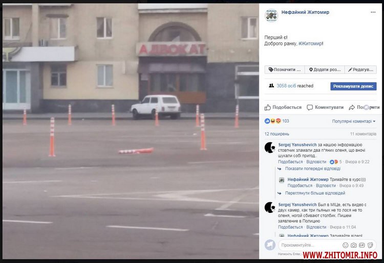 Про це у коментарях під постом спільноти Нефайний Житомир написав керівник КП «ЖУАШ» Сергій Янушевич вранці 23 листопада. Також чоловік написав, що взяв у МІЦі відео з двох камер спостереження, на якому видно, як кілька чоловіків ногами збивають стовпчик. Пізніше Янушевич виклав його на своїй сторінці у Facebook.