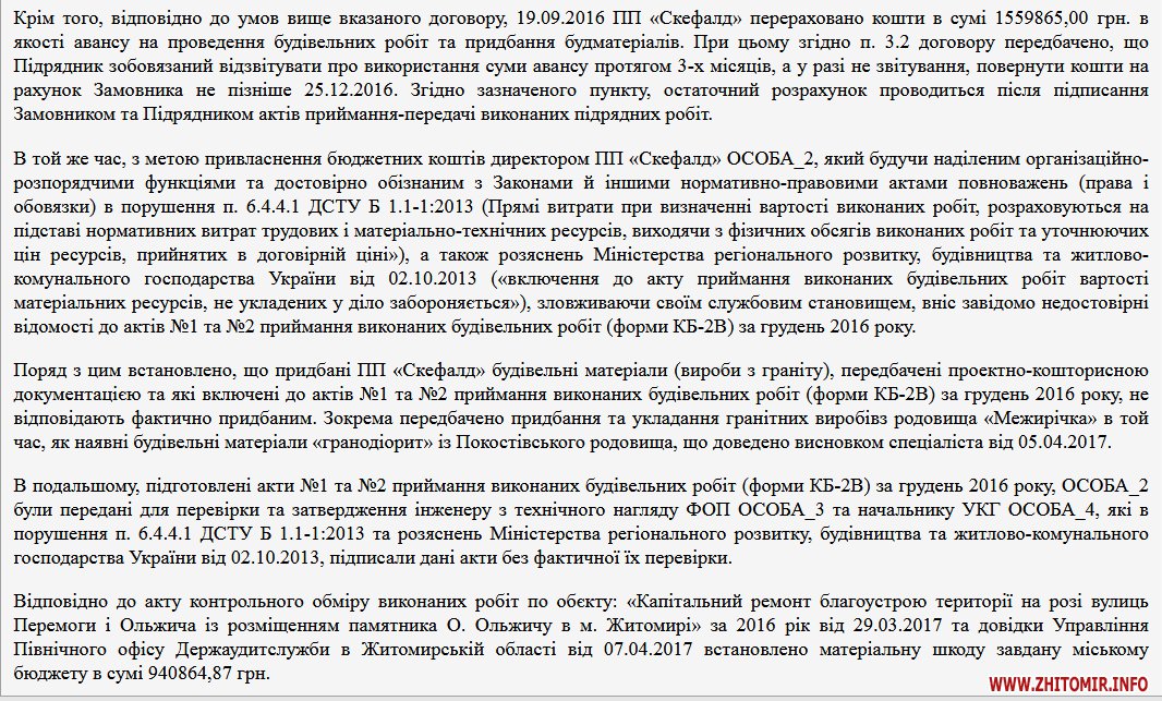 «Досудовим розслідуванням у кримінальному провадженні встановлено, що 06.09.2016 року між Управлінням комунального господарства Житомирської міської ради та ПП «Скефалд», укладено договір №1-ОЛ, предметом якого є проведення робіт з капітального ремонту благоустрою території на розі вулиць Перемоги і Ольжича із розміщенням пам’ятника О. Ольжичу в м. Житомирі, загальною вартістю 2500000,00 грн. Відповідно до п. 10.1 вказаного договору термін його дії до 31.12.2016, але у будь-якому разі до повного виконання сторонами своїх зобов’язань. Однак, у зв’язку з неможливістю проведення будівельних робіт 31.12.2016 між замовником та підрядником укладено додаткову угоду №1, якою продовжено термін виконання робіт до 31.12.2017... Відповідно до акту контрольного обміру виконаних робіт по об’єкту: «Капітальний ремонт благоустрою території на розі вулиць Перемоги і Ольжича із розміщенням пам’ятника О. Ольжичу в м. Житомирі» за 2016 рік від 29.03.2017 та довідки Управління Північного офісу Держаудитслужби в Житомирській області від 07.04.2017 встановлено матеріальну шкоду завдану міському бюджету в сумі 940864,87 грн», - зазначається в матеріалах справи.