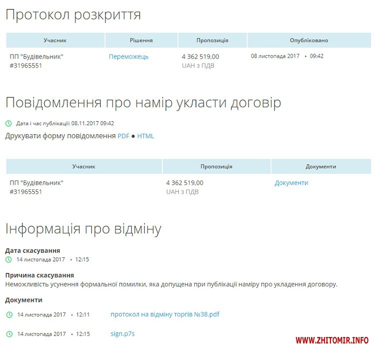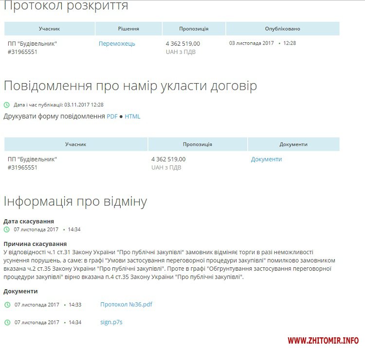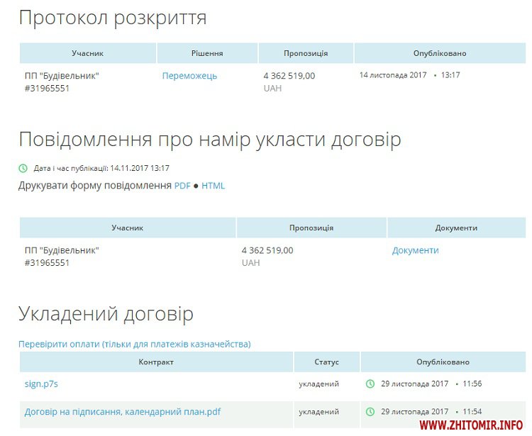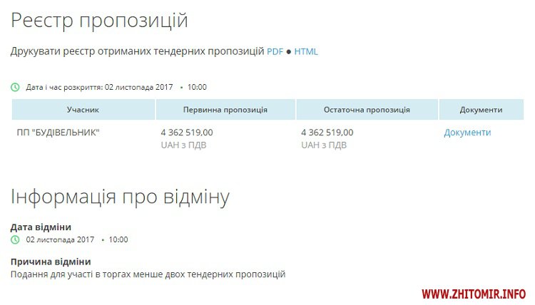 Про це Житомир.info стало відомо з сайту електронних закупівель Prozorro.