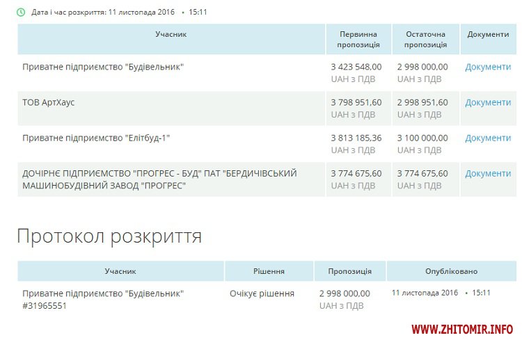 Перше оголошення про проведення торгів на Prozorro з’явилося ще у жовтні 2016 року. Тендерні пропозиції тоді подали 4 підприємства: ТОВ «АртХаус», ПП «ЕлітБуд-1», ДП «Прогрес-Буд» ПАТ «Бердичівський машинобудівний завод Прогрес» та вищезгадане ПП «Будівельник».