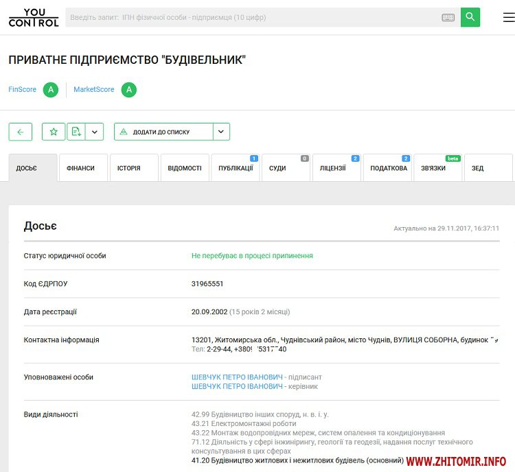 Лише з п’ятого разу фірмі «Будівельник» дістався підряд по будівництву у райцентрі притулку для тварин. За інформацією з сайту YouControl, приватне підприємство було засноване 15 років тому Петром Шевчуком, зареєстроване воно у Чуднові. Основним видом діяльності вказане будівництво житлових і нежитлових будівель.