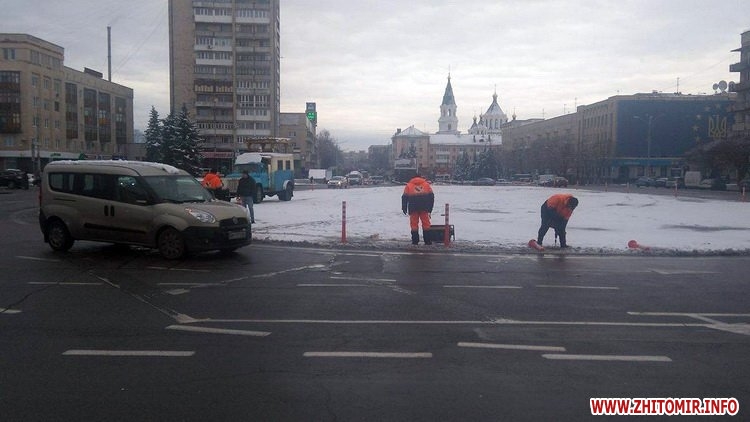 По обіді 11 грудня в центрі Житомира працювали комунальники: вони встановлювали навігаційні стовпчики поблизу драмтеатру на майдані Соборному.