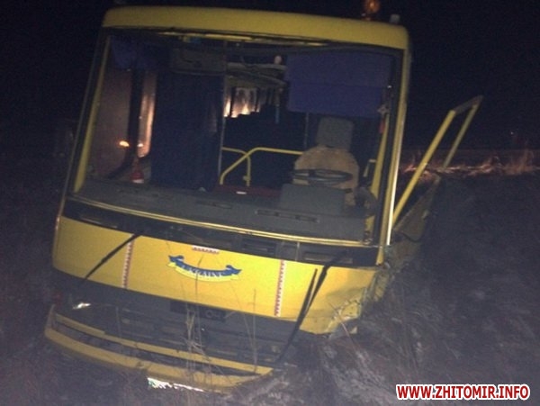 "Дорожньо-транспортна пригода сталася близько 16.30 на 111 км автодороги Виступовичі-Житомир, поблизу с. Веселівки Коростенського району. За попередньою інформацією, 41-річний водій автомобіля BMW-520, рухаючись у напрямку м. Коростеня, не впорався з керуванням транспортним засобом та виїхав на смугу зустрічного руху, де сталося зіткнення з автобусом ТАТА БАЗ. В автобусі на момент ДТП знаходилось 16 дітей різного віку та 28-річна вчителька місцевої школи. Її з тілесними ушкодженнями було доставлено до хірургічного відділення лікарні. Дітям надано медичну допомогу на місці без госпіталізації. Згодом 4 дітей, віком 8, 11, 14 та 15 років, додатково звернулись за медичної допомогою: у них діагностовано забої різних частин тіла та призначено амбулаторне лікування", - інформує поліція.