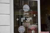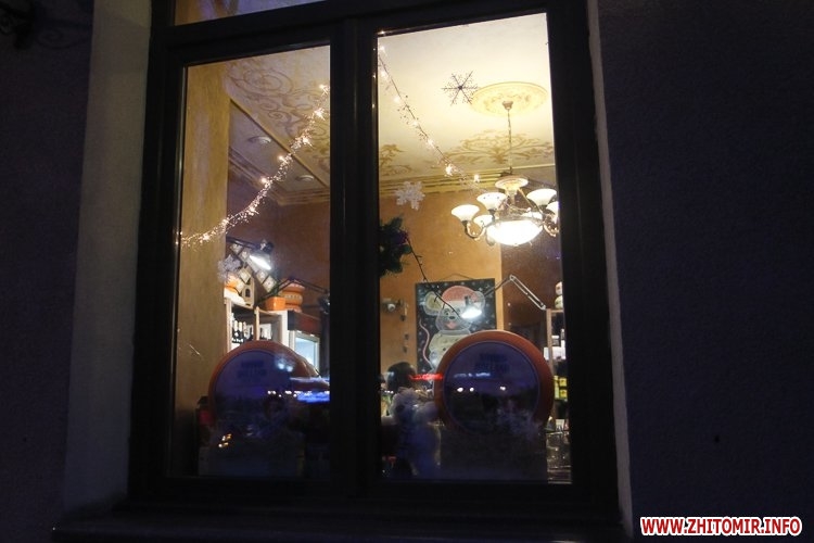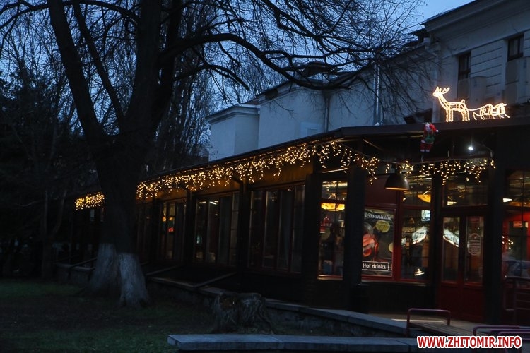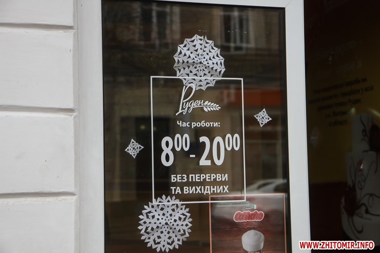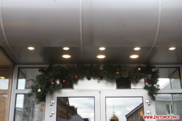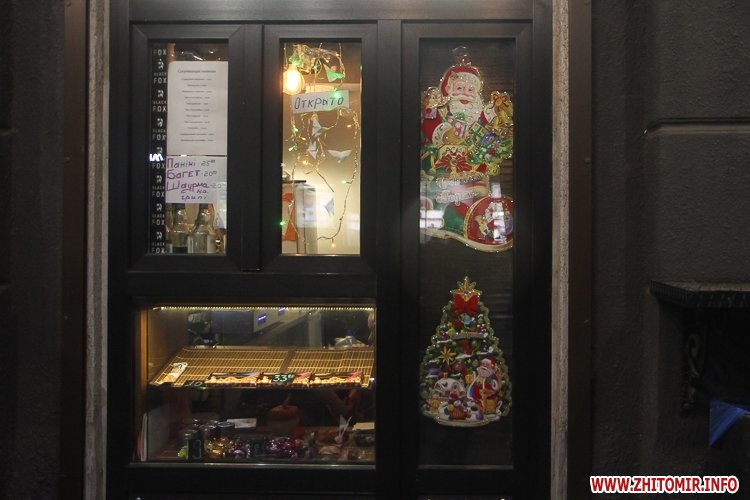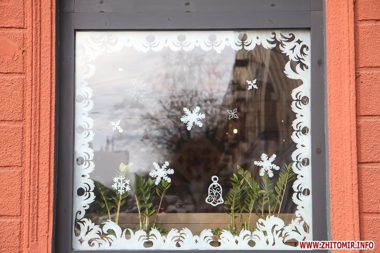 За 20 днів до Нового року у центрі Житомира знайти яскраво прикрашені заклади дуже складно. У центрі більшість власників вирішили «не зловживати» новорічною мішурою й наліпили по кілька сніжинок чи малопомітних новорічних символів, залишивши великі вікна повністю заліпленими рекламними плакатами.