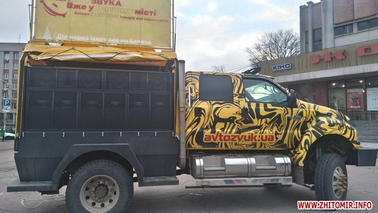 У Житомирі 17 грудня на майдані Корольова, не чекаючи новорічних та різдвяних свят, завітав Avtozvuk. Це велетенський автомобіль у якому є 20 кіловат концертного звука та 5,8 літрів двигуна.