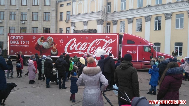 Також, під стінами Житомирської ОДА, знаходився автомобіль «Coca-cola». Помічники Санта-Клауса роздавали малечі подарунки та пляшечки напою «Кока-Кола» за розказаний новорічний вірш.
