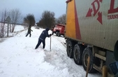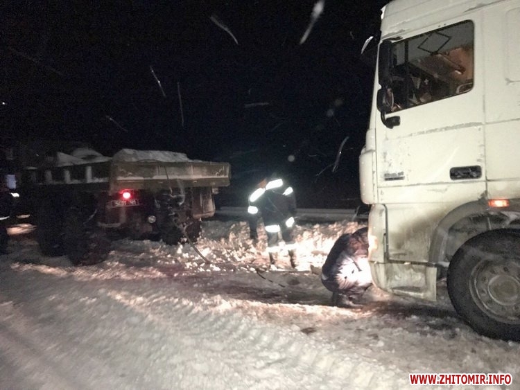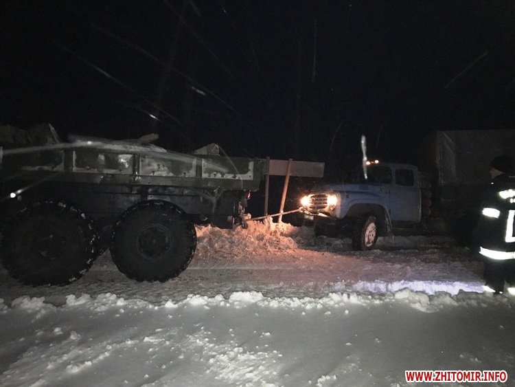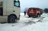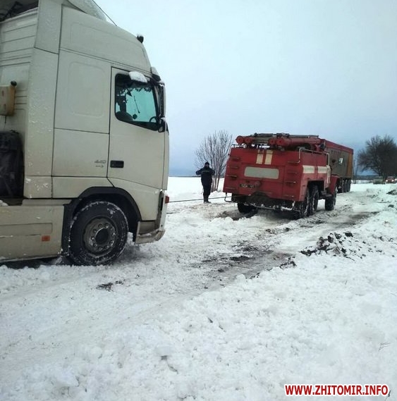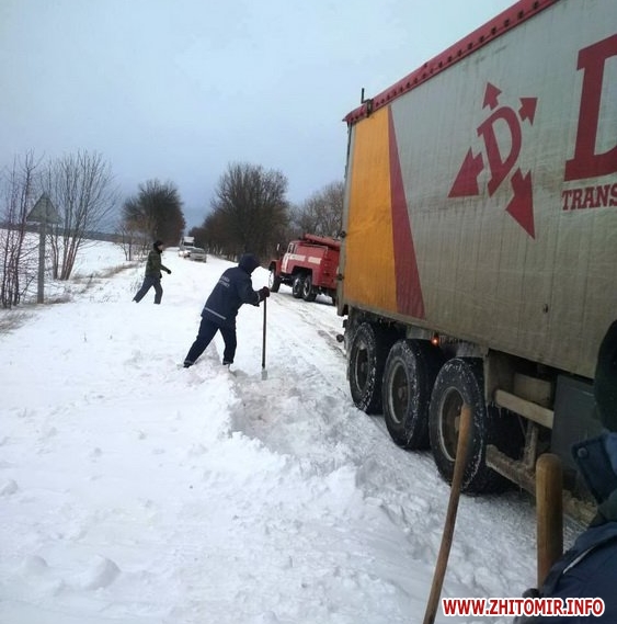 «Загалом за добу рятувальниками вивільнено зі снігових заметів 39 одиниць техніки. Найбільш складними видалися ділянки доріг на півдні області. Через затор із вантажівок було обмежено рух на 308 та 313 кілометрів траси Кременець – Біла Церква (Ружинський район) та 222 км траси Виступовичі – Могилів-Подільський (в районі с.Хажин, Бердичівського району). Зокрема, у Ружинському районі – це складна для руху ділянка звивистої горбистої вузької дороги, на якій утворився затор із вантажівок. Для відновлення руху, крім пожежної техніки, рятувальники залучили важку інженерну техніку (тягач КРАЗ) аварійно-рятувального загону із Житомира. Зі снігових заметів та заторів бійці ДСНС вилучили 8 одиниць техніки та розвели і врегулювали рух близько 500 автомобілів», - йдеться у повідомленні.