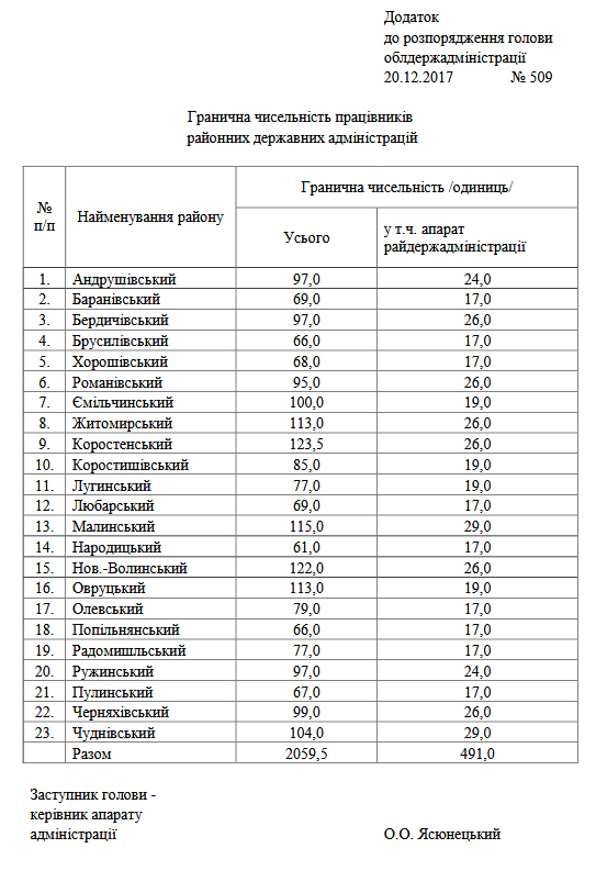 Розпорядженням від 30 січня 2017 року гранична чисельність працівників 23 РДА була 2218 одиниць, відтепер – 2059,5. У семи райдержадміністраціях чисельність працівників скоротилася: в Ємільчинській – на 24, Коростишівській – на 19,5, Лугинській – на 12, Любарській – на 22, Овруцькій – на 31, Радомишльській – на 28, Пулинській – на 24. Натомість Олевській райдержадміністрації додали 2 одиниці.