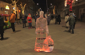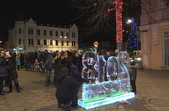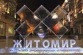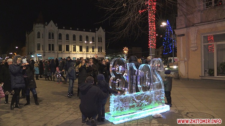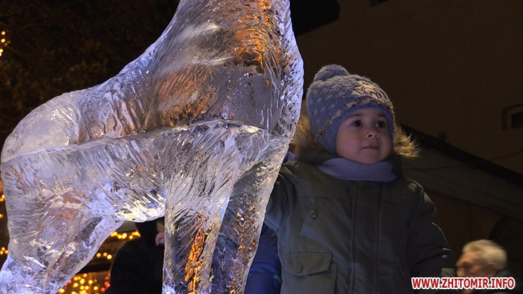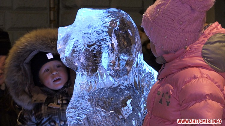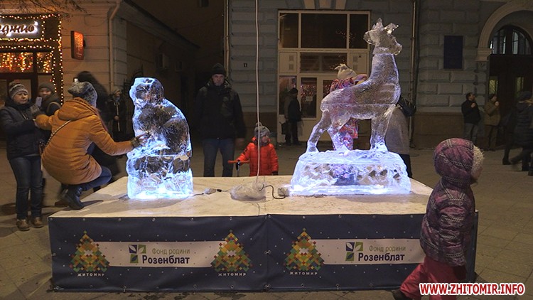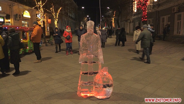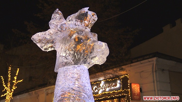 6 крижаних скульптур встановили у Житомирі 8 січня. Льодяний святий Миколай, ангел, олень, собака, логотип Житомира та число 2018 розміщені вздовж вулиці Михайлівської.