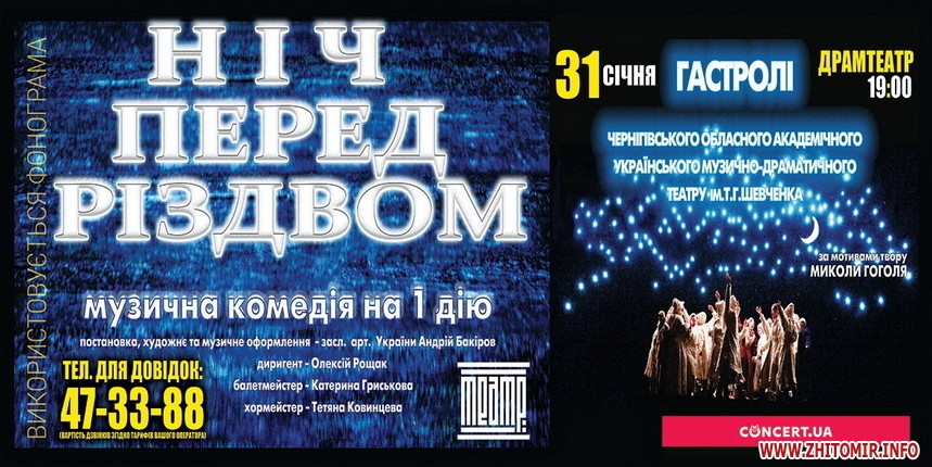 31 січня в Житомирському муздрамтеатрі в рамках гастролей пройде вистава акторів Чернігівського обласного академічного українського музично-драматичного театру ім. Т. Г. Шевченка. Вони покажуть музичну комедію на 1 дію «Ніч перед Різдвом» за мотивами повісті Миколи Гоголя (діалоги Михайла Старицького).