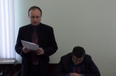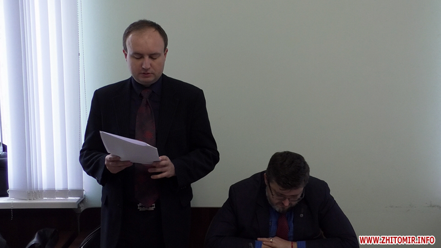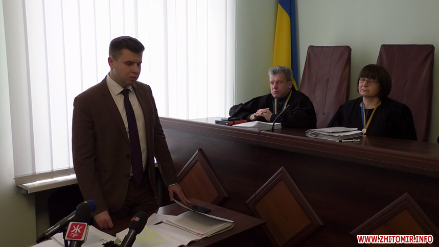 «Суддя Покатілов Олексій Борисович, який входить до складу колегії суддів брав участь у даному кримінальному провадженні у якості слідчого судді під час досудового слідства розглядаючи скаргу сторони захисту. Відповідно до ч. 1 ст. 76 КПК України суддя, який брав участь у кримінальному провадженні під час досудового розслідування не має права брати участі у цьому ж провадженні в суді першої, апеляційної і касаційної інстанціях. 29 грудня 2017 року головою держави було постановлено Указ президента України «Про ліквідацію та утворення місцевих загальних судів». Відповідно, ліквідовано Корольовський районний суд м. Житомир. Передбачено утворення окружного суду м. Житомир», - зачитує клопотання адвокат Руслан Берещенко.