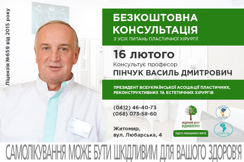 Тільки 16 лютого Медичний центр «Відновлення» пропонує отримати безкоштовну консультацію у пластичного хірурга Василя Пінчука (професор, президент всеукраїнської асоціації пластичних, реконструктивних та естетичних хірургів). Об’єктивна та кваліфікована консультація професіонального лікаря гарантована. Нарешті ви зможе втілити Ваші бажання в реальність, адже саме «Відновлення» використовує сучасні методи створення ідеальної зовнішності.